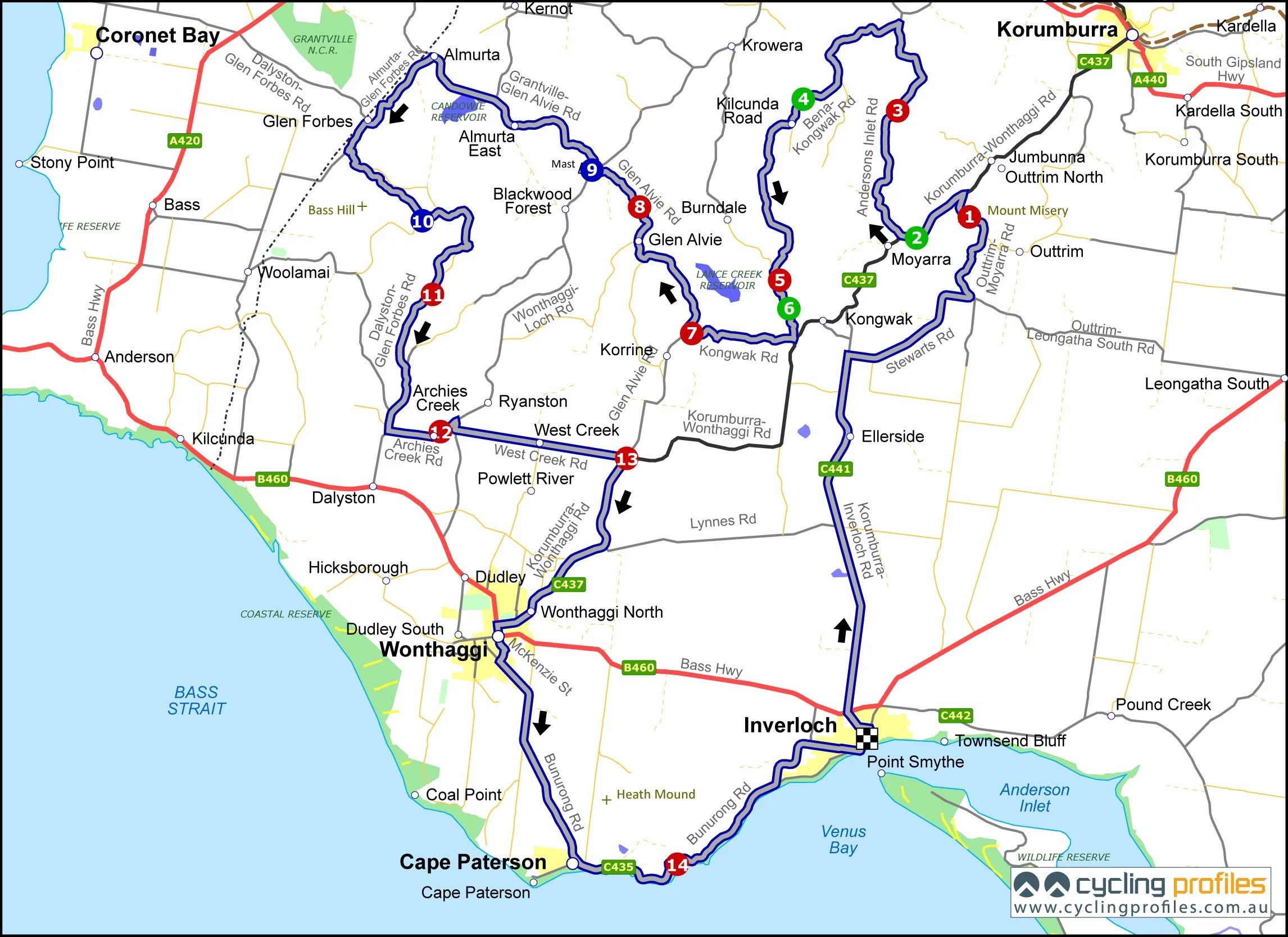 A challenging 121km route out of Inverloch, tackling the 250m, 4km Mt Misery climb followed by 13 more undulations around Bass Coast’s back roads. Finally, you’ll be rewarded with a meander downhill into Wonthaggi and the coastal road on the return from Cape Paterson and back along the outstanding coast road into Invy!