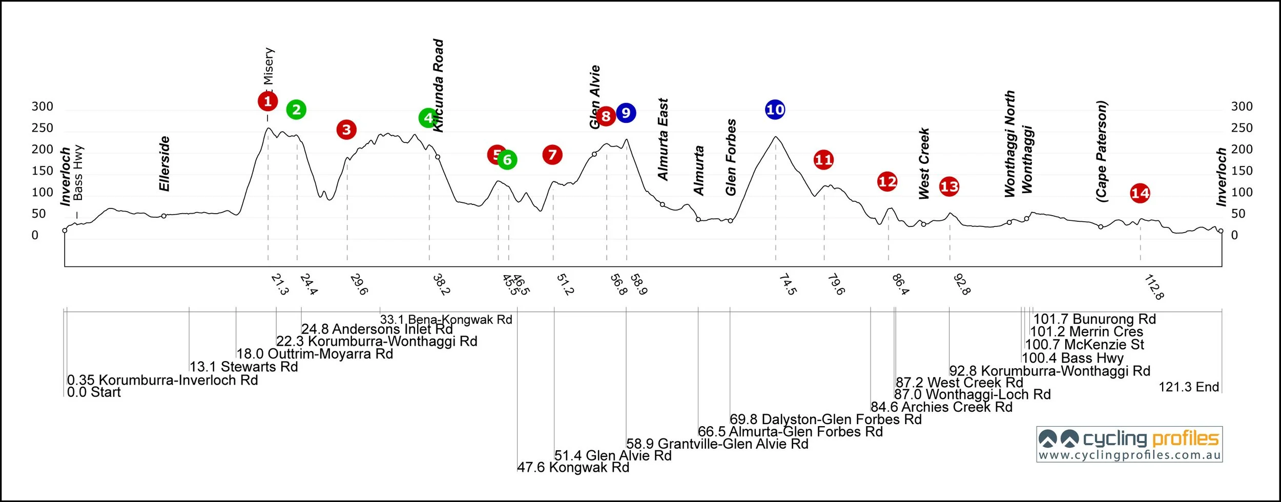 Start time and location: arrive at 7:45am for 121km briefing and 8am start. All rides start and finish on A’Beckett Street, Inverloch outside The Inverloch Community Hub.